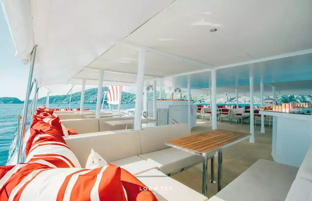 A perfect party boat Lobster is a 79 feet yacht built in 2019 by Custom Made. It can host up to 145 people and is the best yacht for party, large group day trips, half-day trips, and sunset cruises. For those feeling groovy, a full-day party boat tour onboard Lobster is a fantastic way to experience sea attractions with a glass of champagne nearby Phuket. If you’re looking for a boat tour packed with excitement that is tailor-made to meet your needs, Lobster is a fantastic party boat that will deliver.