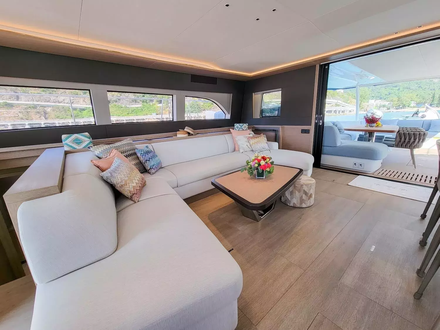 A standout feature of Blue Iris is its stability at higher speeds ensuring a smooth and pleasant journey. The dual hull design not only enhances stability. Also offers more space compared to traditional monohull yachts making it well suited for large groups or families. Ideal for week getaways, Blue Iris combines the thrill of speed with the luxury of a yacht. Its robust engines enable travel between destinations allowing you to make the most of your time exploring rather than cruising. Whether you're island hopping or cruising through waters Blue Iris ensures an exciting journey.