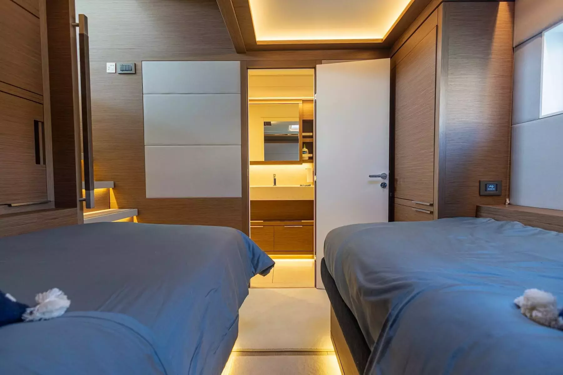 A standout feature of Mio Porcellino is its stability at higher speeds ensuring a smooth and pleasant journey. The dual hull design not only enhances stability. Also offers more space compared to traditional monohull yachts making it well suited for large groups or families. Ideal for week getaways, Mio Porcellino combines the thrill of speed with the luxury of a yacht. Its robust engines enable travel between destinations allowing you to make the most of your time exploring rather than cruising. Whether you're island hopping or cruising through waters Mio Porcellino ensures an exciting journey.