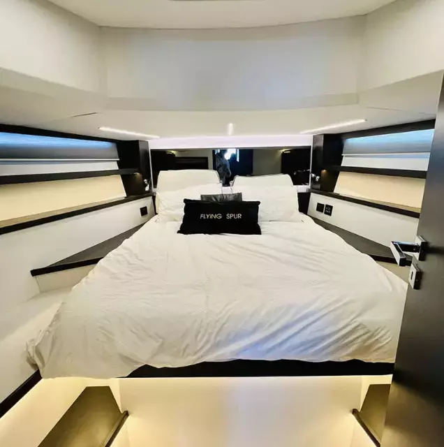 Powerboat Flying Spur offers an adventure with a deck and a dedicated crew ready to cater to your needs ensuring that your speedboat charter, in Mediterranean becomes an unforgettable memory. Onboard Flying Spur you will also have the opportunity to soak up the sun and get your tans on, feeling the refreshing wind in your hair while cruising from one place to another.