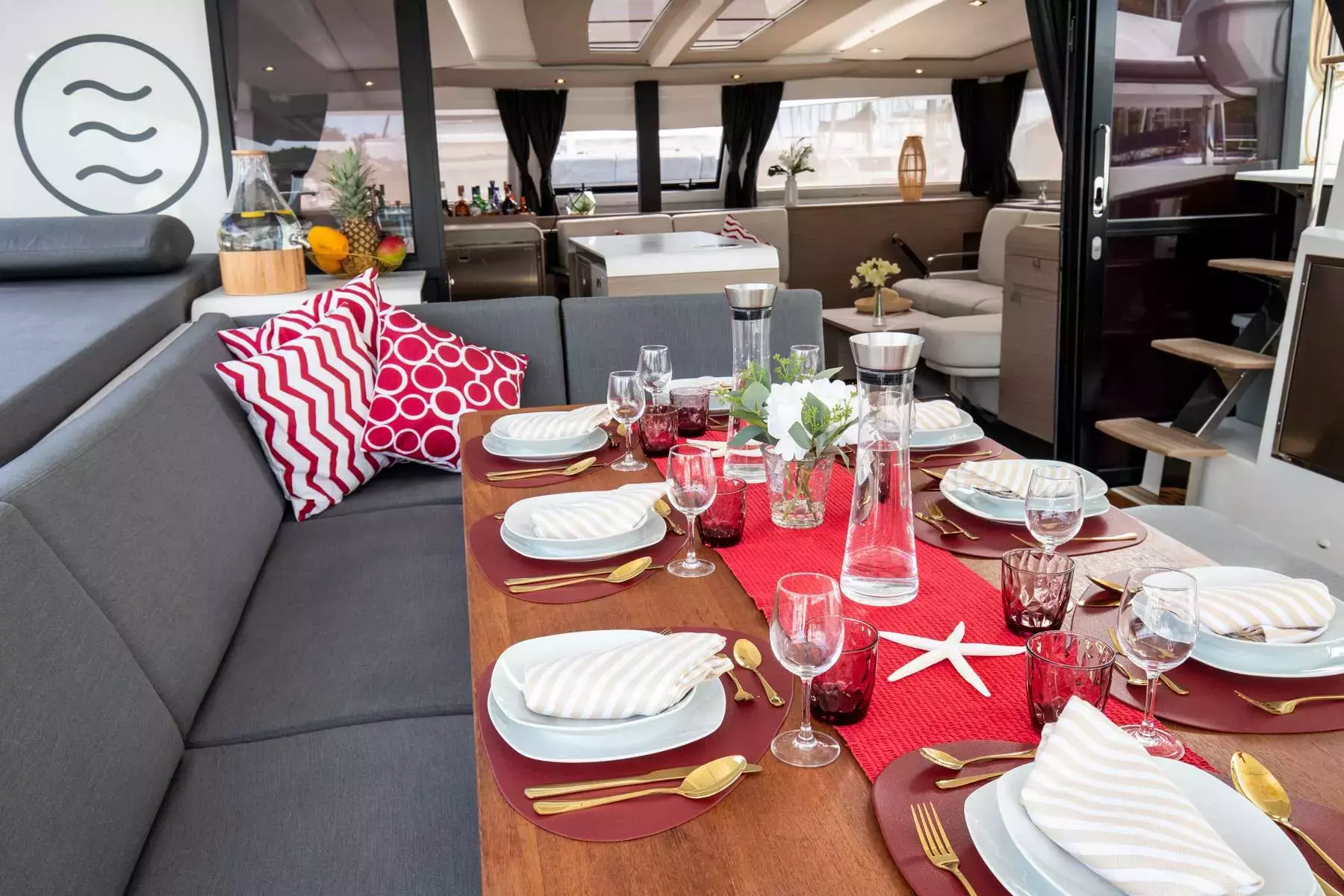 "Wave" is a 15m (49ft) long Sailing Catamaran with 5 cabins and enough space for 12 guests during day charters. The Boat was built in 2022 by Fountaine Pajot and can reach a top speed of 12 knots. You can rent Wave with a crew for $2,789 per day and enjoy a Boating holiday with your family and friends.