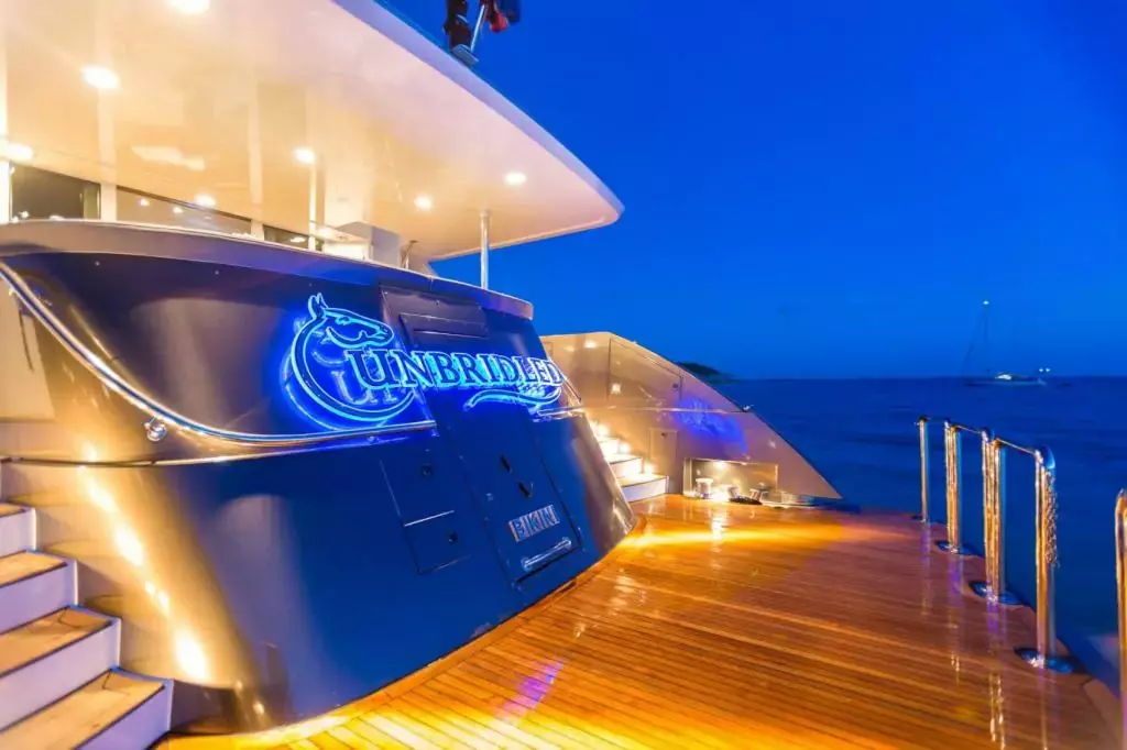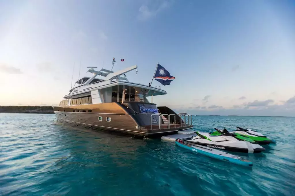 Unbridled is a 115 feet superyacht built for thrill seekers in mind, wishing to explore boundaries. With 4 cabins, Unbridled accommodates 8 guests, and features the latest and most exciting water toys you can find today. Built by Crescent Yachts in 1994 and refitted in 2015, adrenaline junkies will have the time of their lives on board this luxurious yacht fit for adventures on the seas of Caribbean.