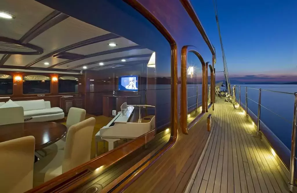Aria I is a 184 feet sailing yacht built in 2011 and refitted in 2016. It has 5 cabins and sleeps 10, built by master builder Medyat. A beautiful sailing yacht that offers more than just comfort and style, Aria I provides privacy, relaxation, and adventures, which make up the primary ingredients for a romantic getaway or a sailing holiday along scenic shores with family and friends.