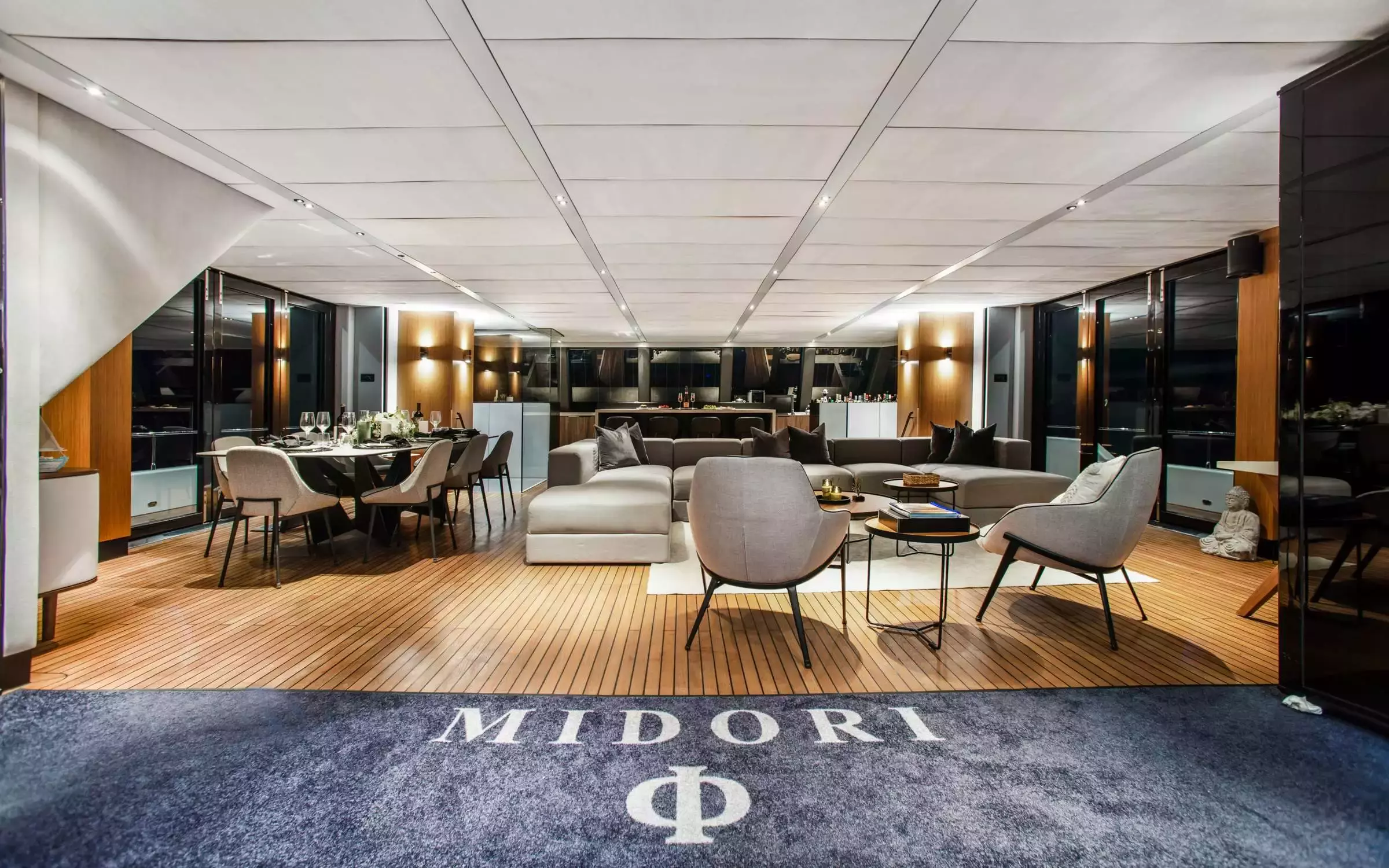 Step aboard the Midori catamaran, where every element exudes opulence and elegance. This spacious luxury vessel spans 69 ft boasting a deck for various activities. Whether indulging in a dining experience admiring a mesmerizing sunset with a glass of champagne or partaking in water sports Midori promises a yachting getaway. Perfect for charters this catamaran offers a blend of excitement and serenity.